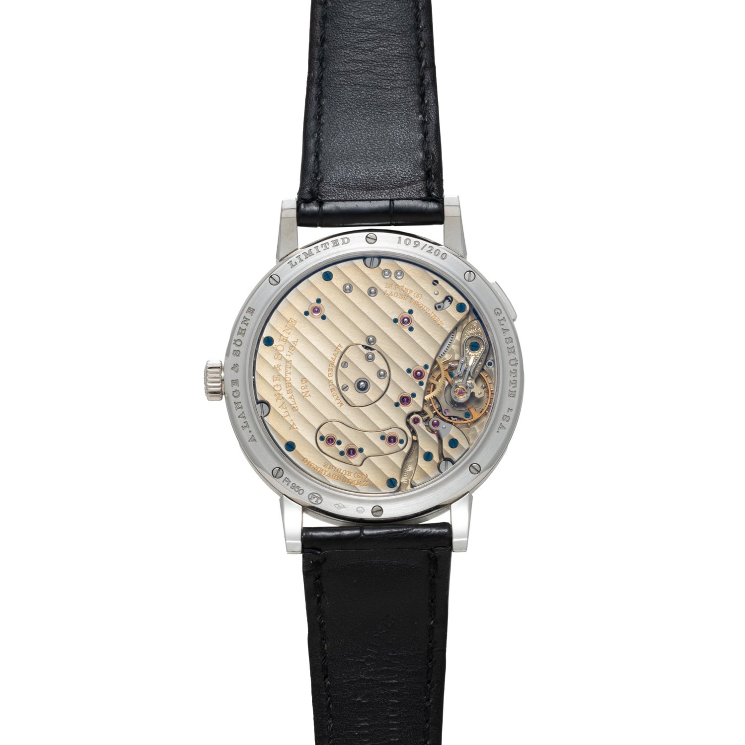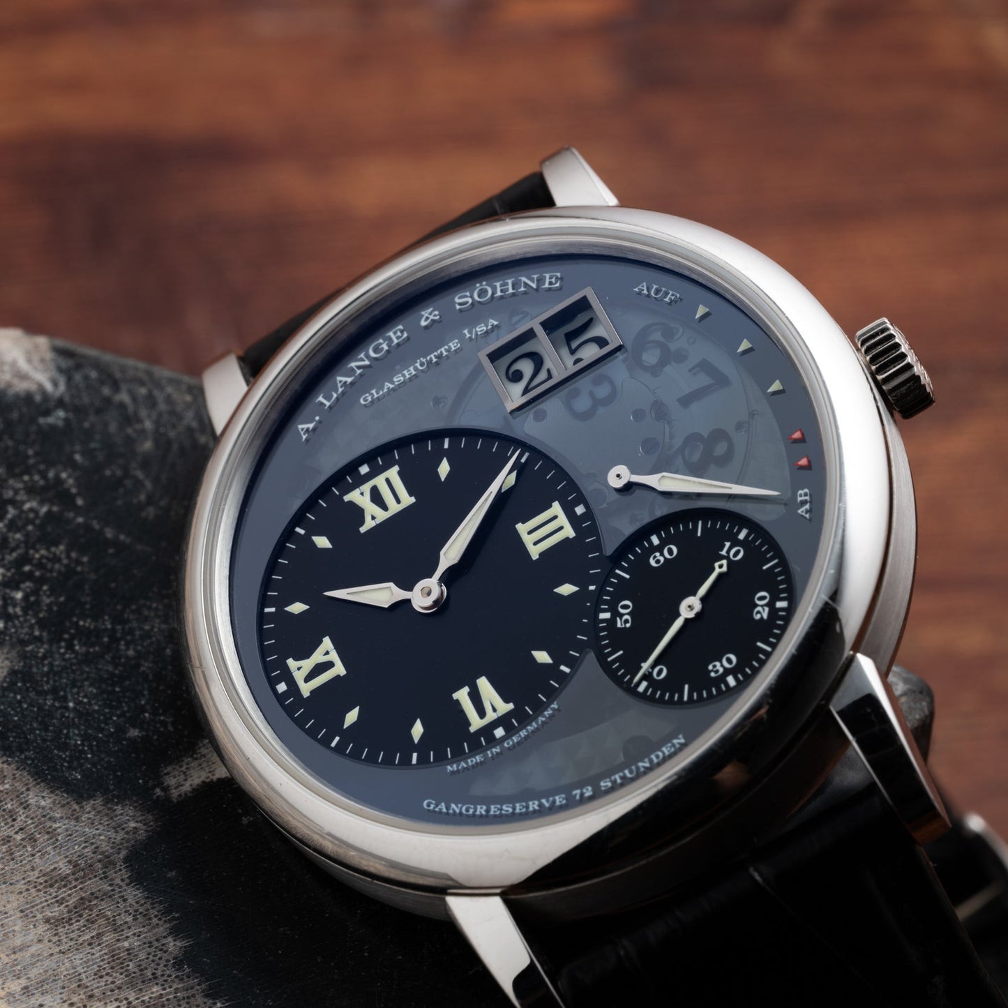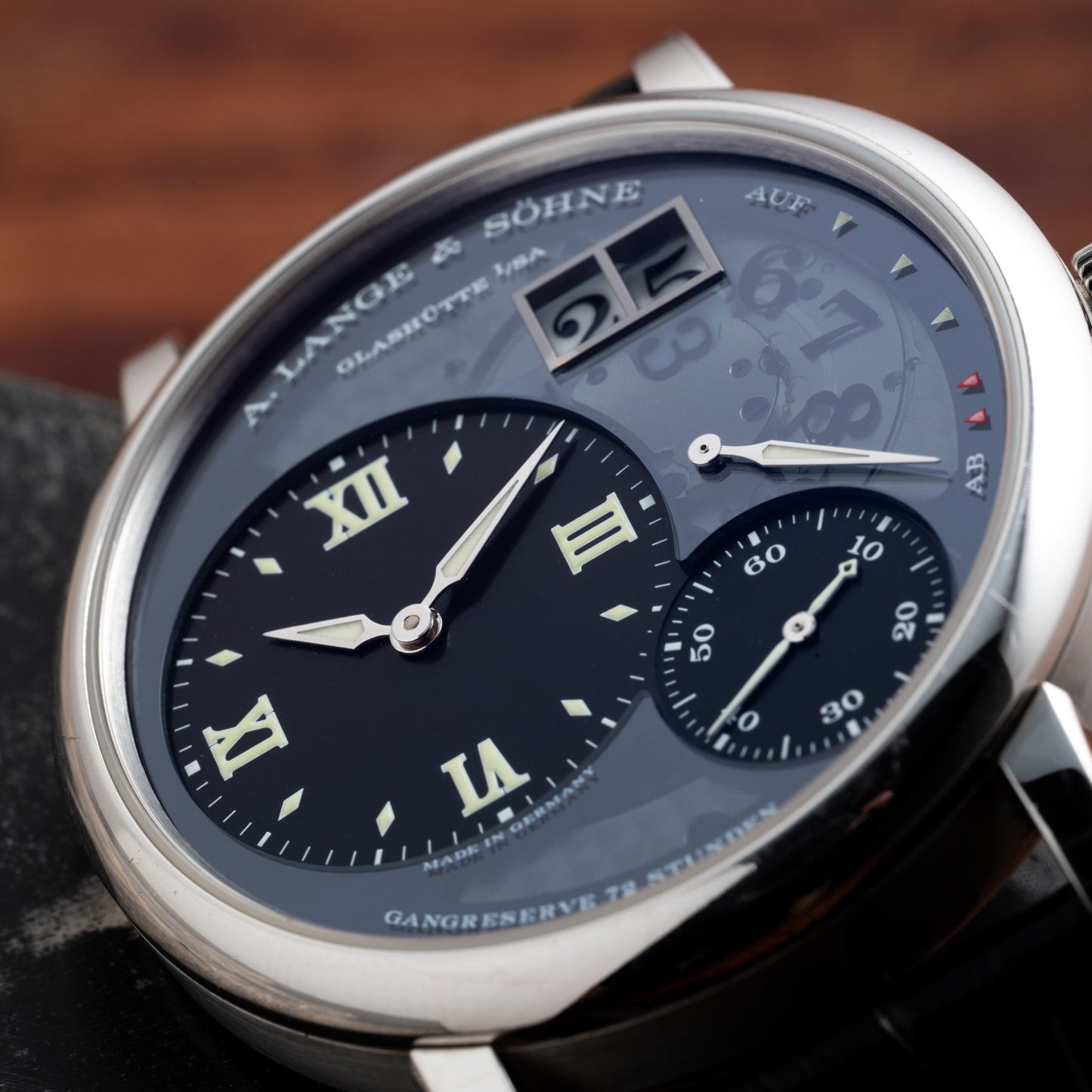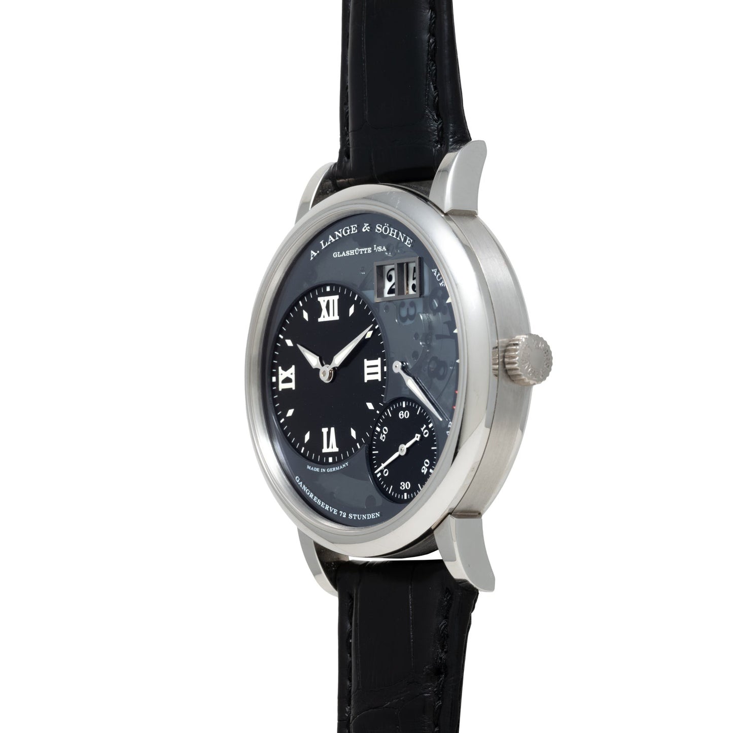 This particular watch, a Grand Lange 1, is a slightly upsized version of the classic. Dating to the 2020s, it features a 41mm platinum case, a sapphire crystal, a signed crown, a polished bezel, a satin silver dial with matching alpha handsets, and a sapphire exhibition case back. It’s fitted to a black alligator leather strap with a signed platinum pin buckle.