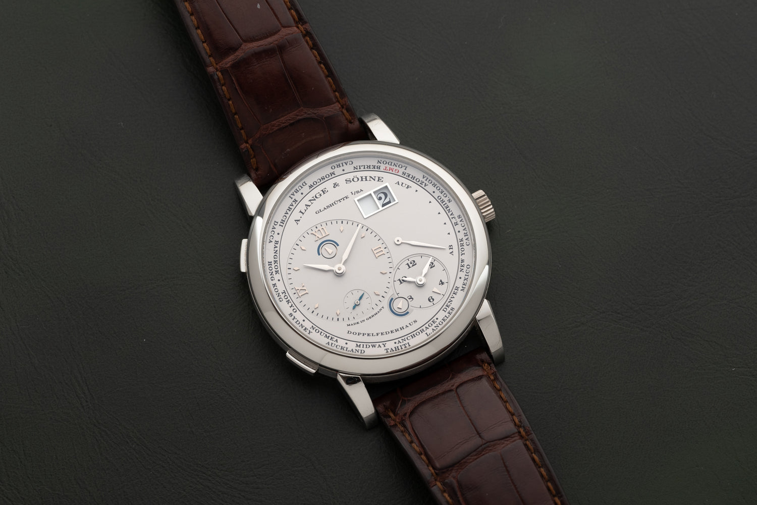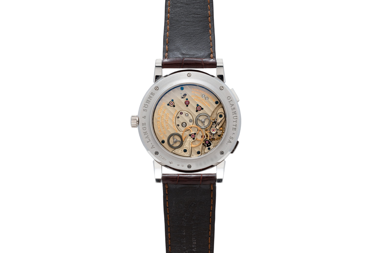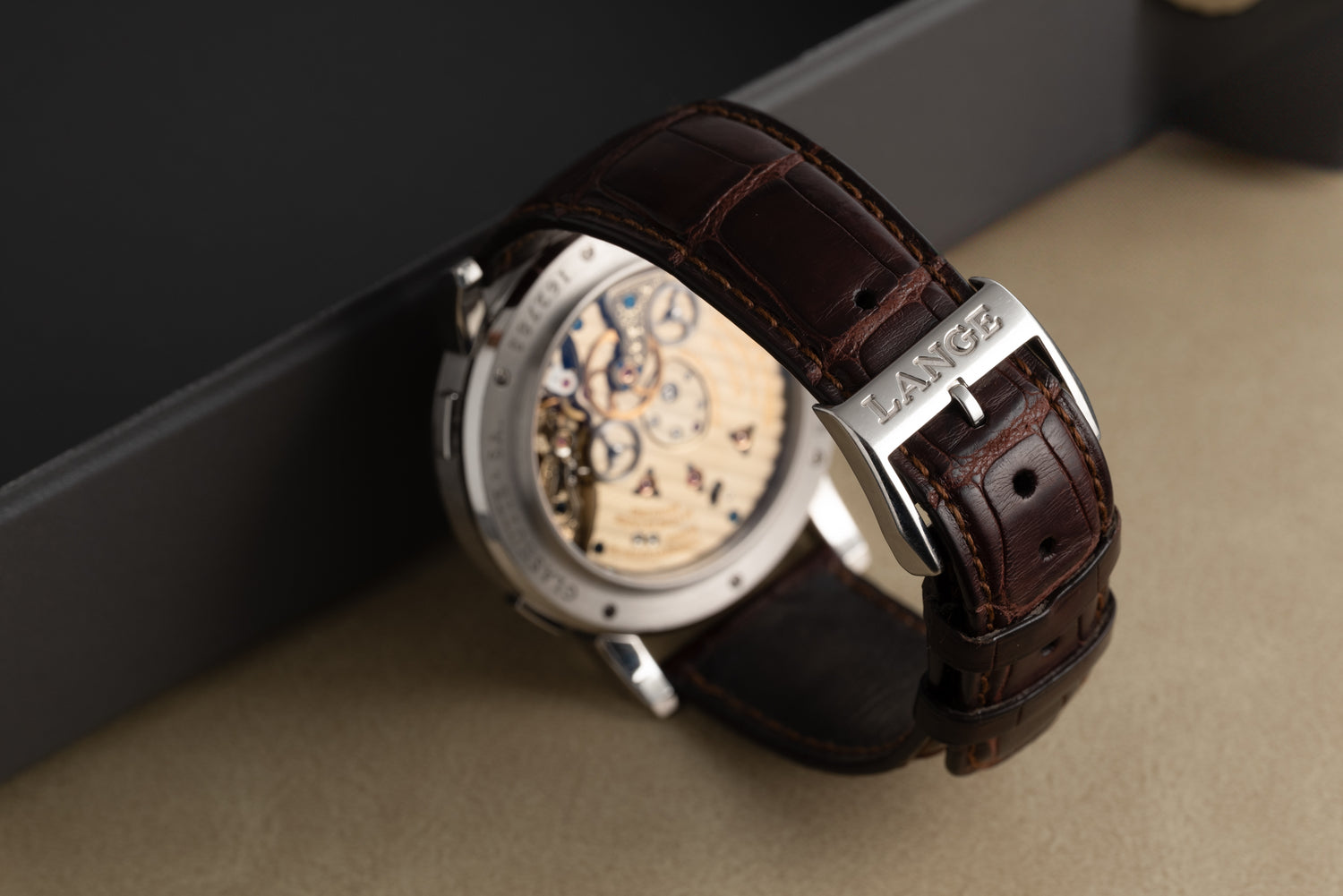 With its 42mm platinum case, this particular example features a lovely satin silver dial with applied indices and a matching 'alpha' handset, a signed brown alligator leather strap with a signed platinum pin buckle, and perhaps the best part of any Lange — a sapphire caseback for crystal clear viewing of the horological delight that is a Lange movement.