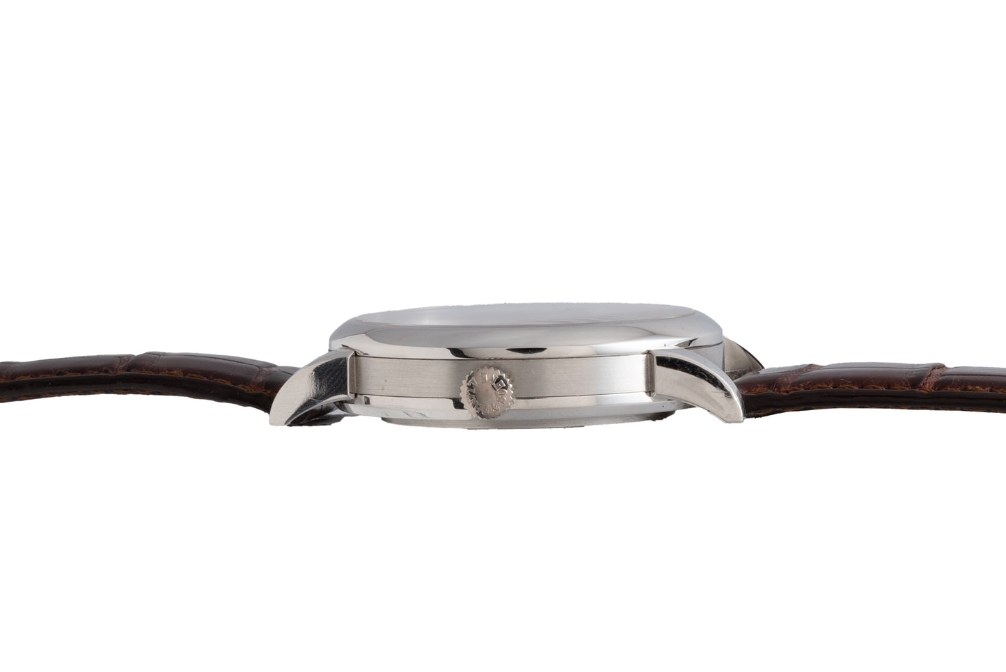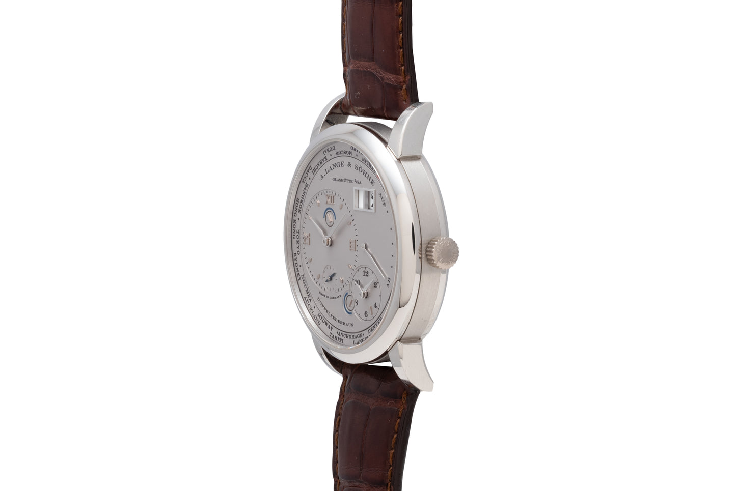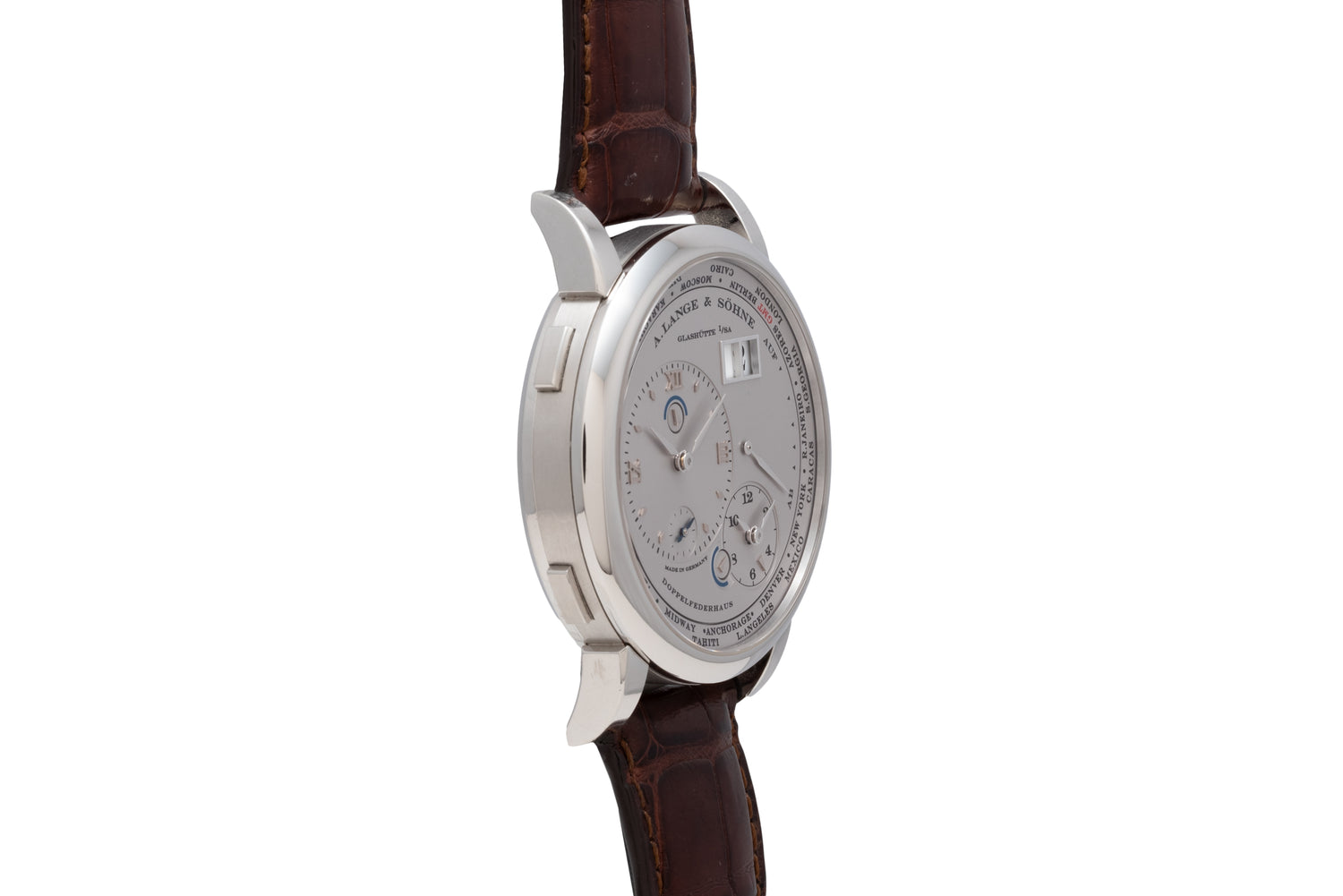 With its 42mm platinum case, this particular example features a lovely satin silver dial with applied indices and a matching 'alpha' handset, a signed brown alligator leather strap with a signed platinum pin buckle, and perhaps the best part of any Lange — a sapphire caseback for crystal clear viewing of the horological delight that is a Lange movement.