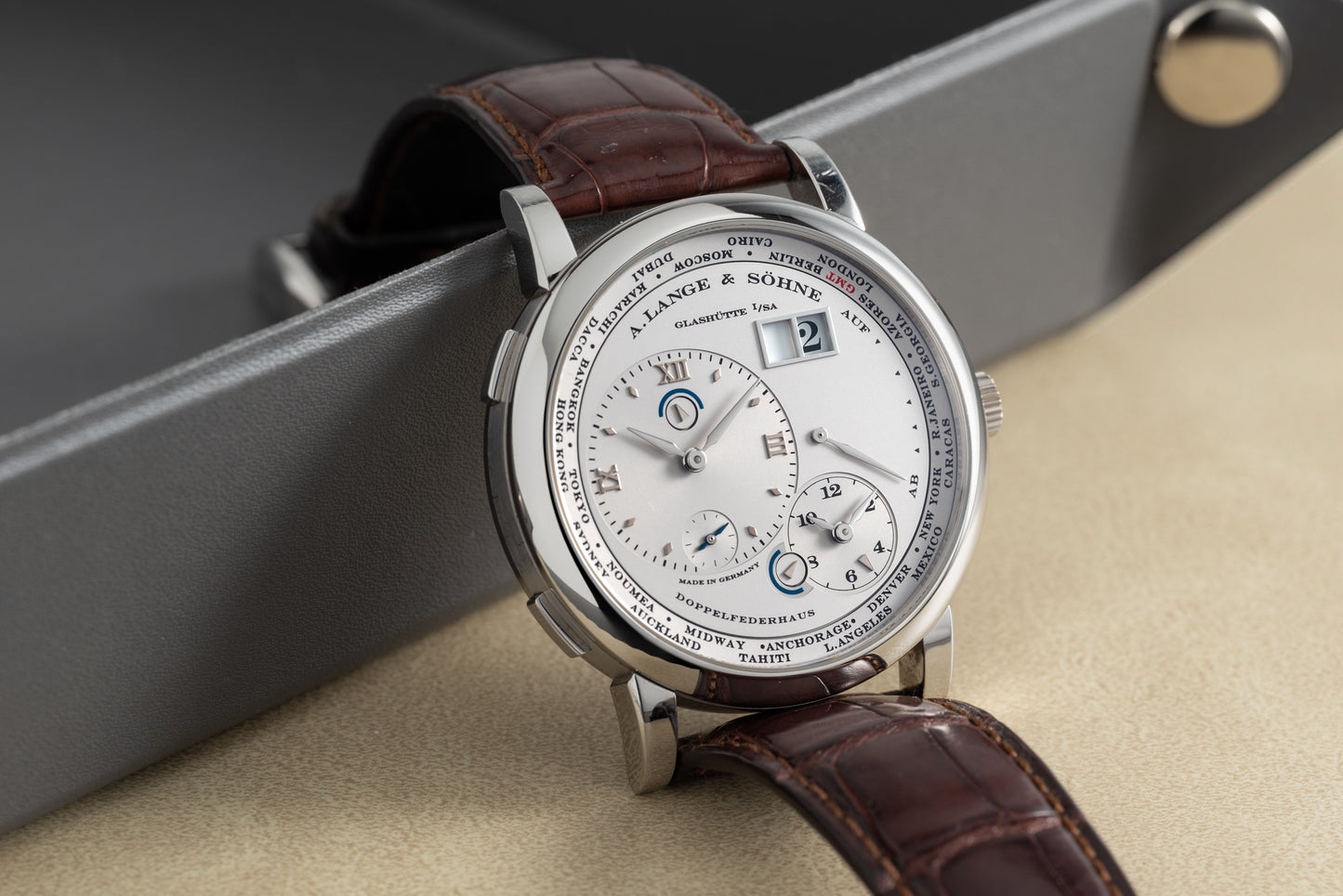 The Lange 1 has seen many variations, from a tourbillon to the Timezone, seen here. Introduced in 2005, it maintains the classic lines of the Lange 1 by incorporating the world time and AM/PM indicator into the sub-seconds dial at 5 o’clock, plus a revolving outer GMT band with the names of 24 cities. Powered by the manually wound Calibre L031.1, it also includes hacking seconds, a power reserve indicator, an offset main dial with subsidiary seconds and AM/PM indicator — all the hallmarks of the classic Lange 1. Two pushers — one for the date at 10 o’clock and one for the world time function at 8 o’clock — are subtly integrated into the watch’s left side.