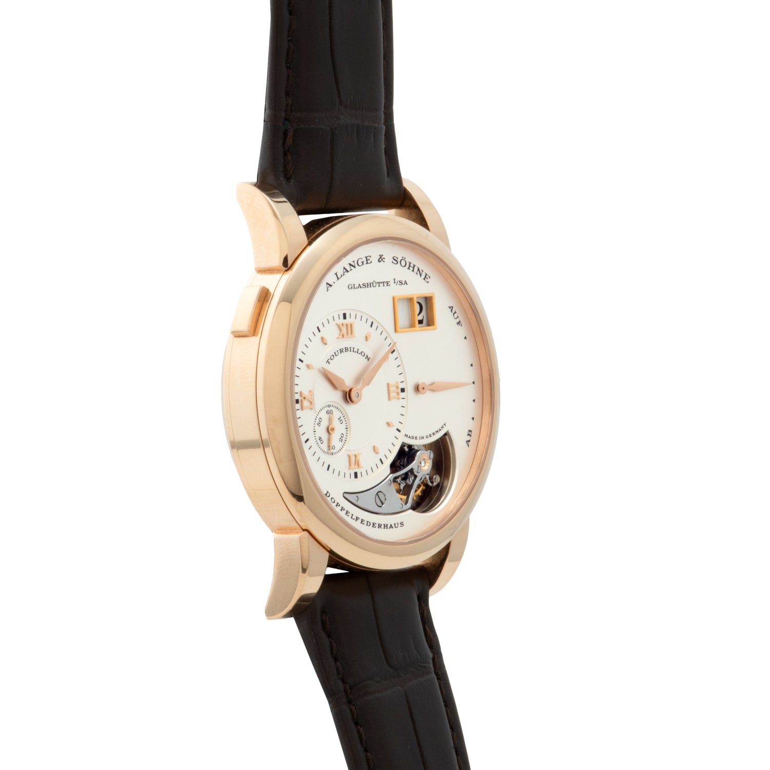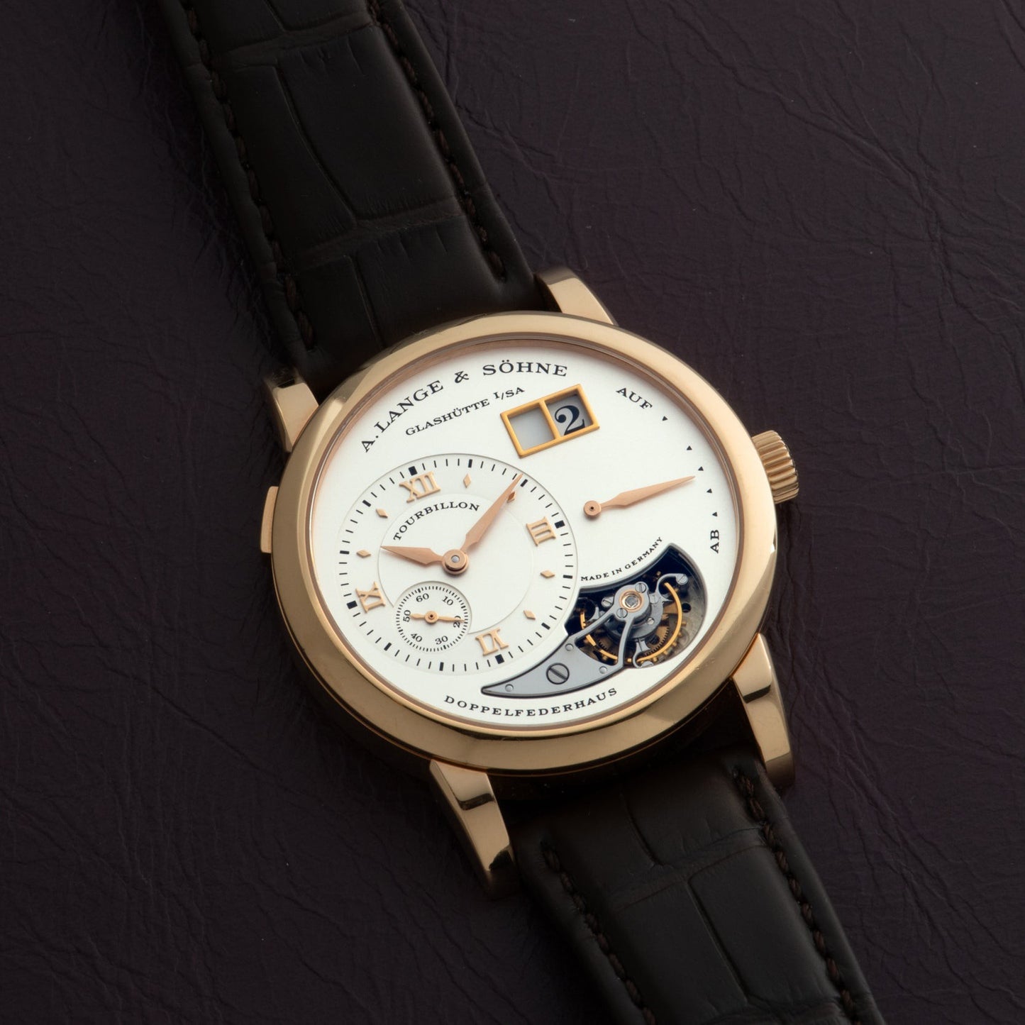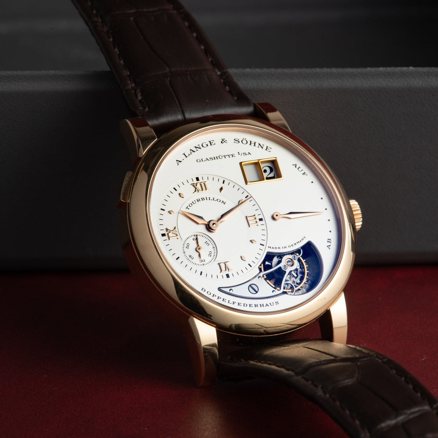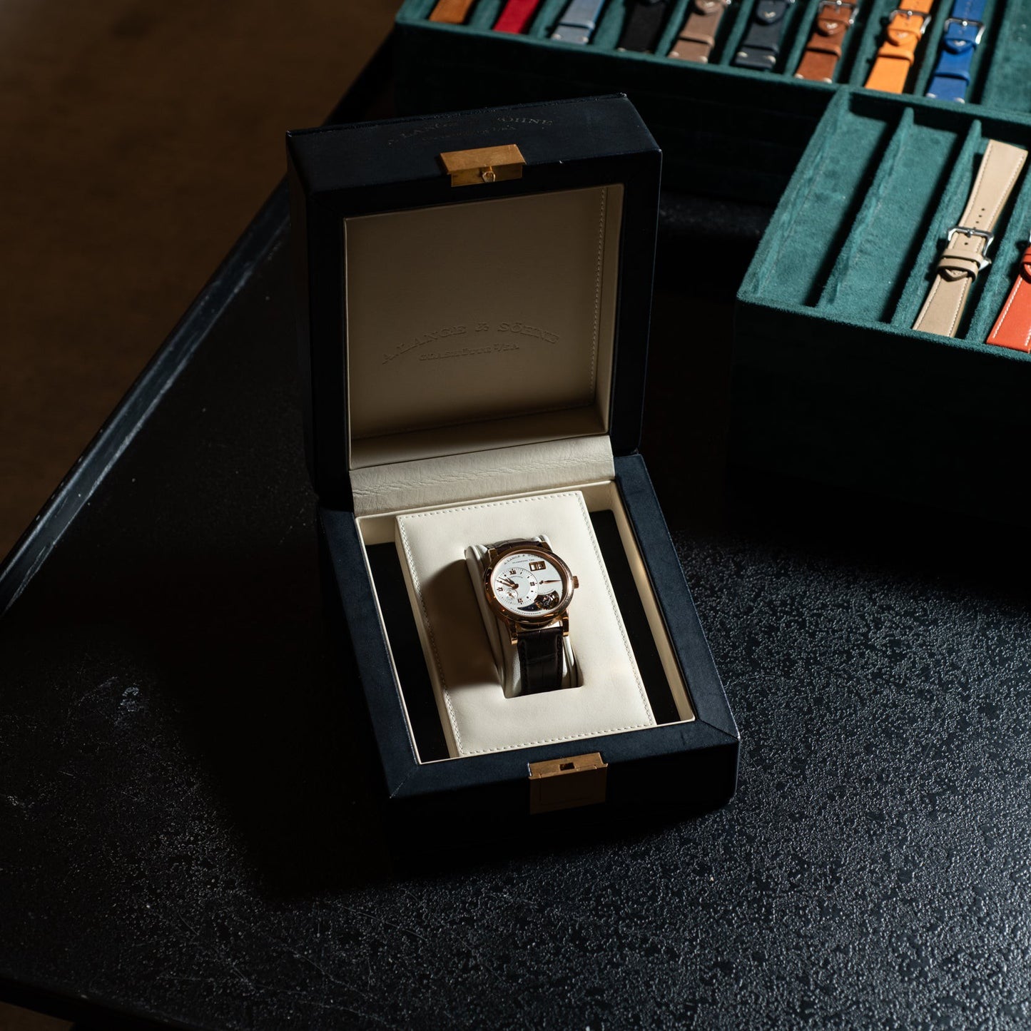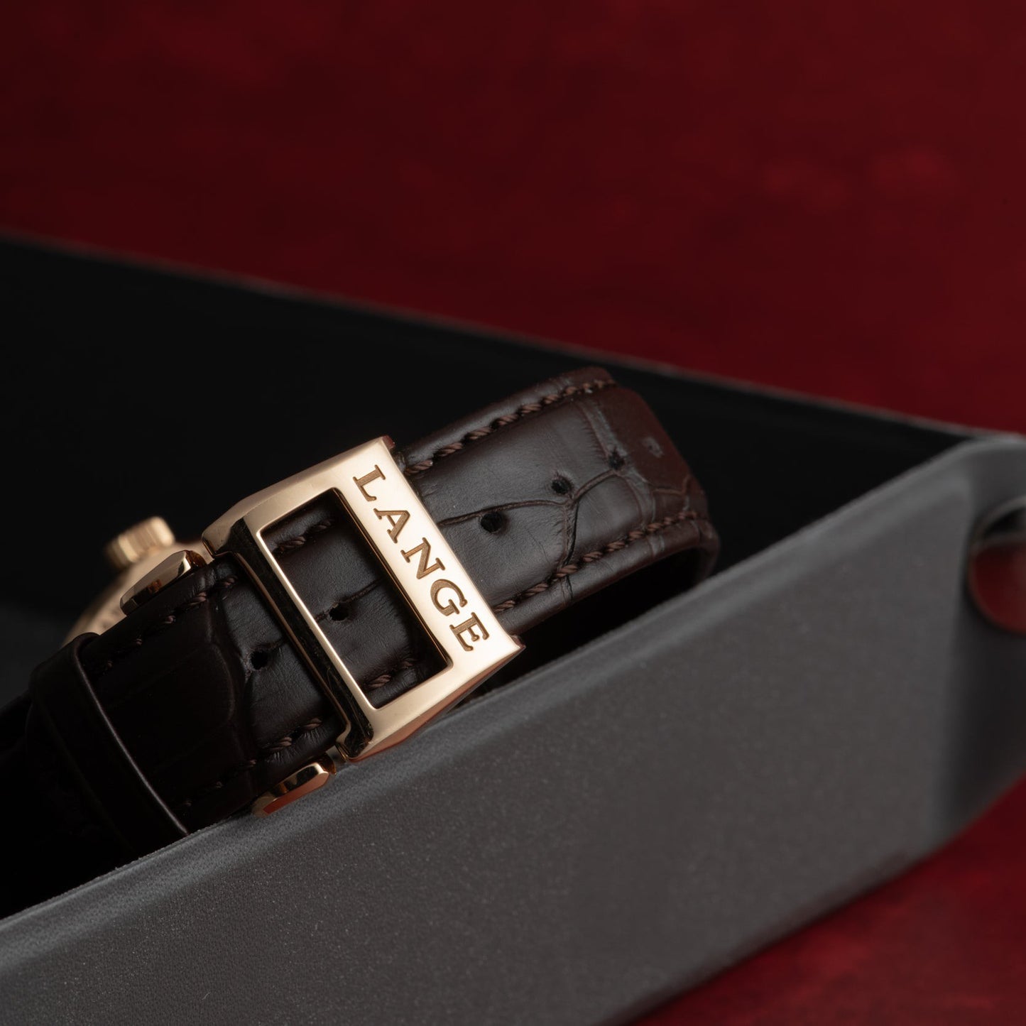 Further, this piece comes complete with its box and correct 18K yellow gold deployant clasp, a detail found on Lange’s most exclusive pieces.
