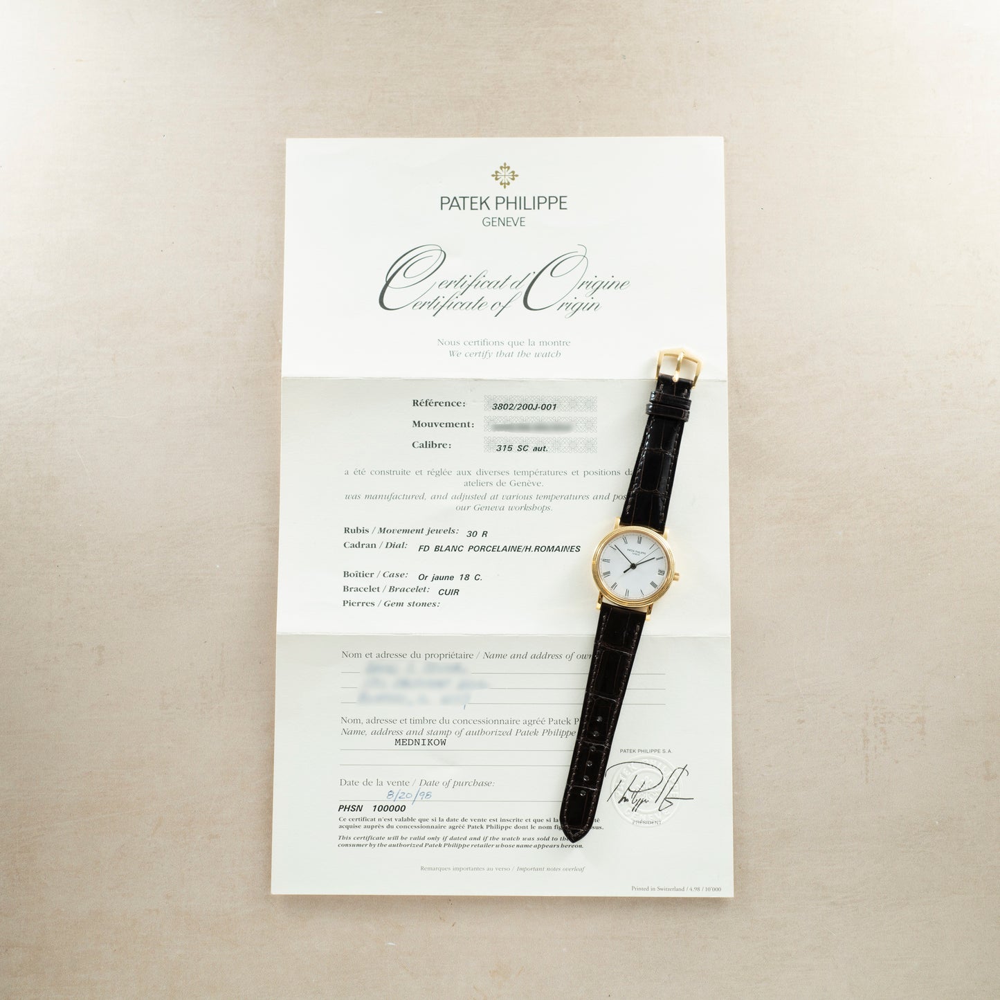 This particular Calatrava, a Reference 3802/200J-001, features a 33mm yellow gold case with a a clous de Paris bezel, a signed crown, and a sapphire crystal. Beneath this is a gorgeous, glossy white dial with painted 'Roman' indices and a matching 'pencil' handset, a date window at 3:00, and a signed black crocodile leather strap with a signed yellow gold pin buckle. Powered by Patek's Calibre 315 SC automatic-winding movement, this piece is accompanied by its Certificate of Origin dating to 1998.