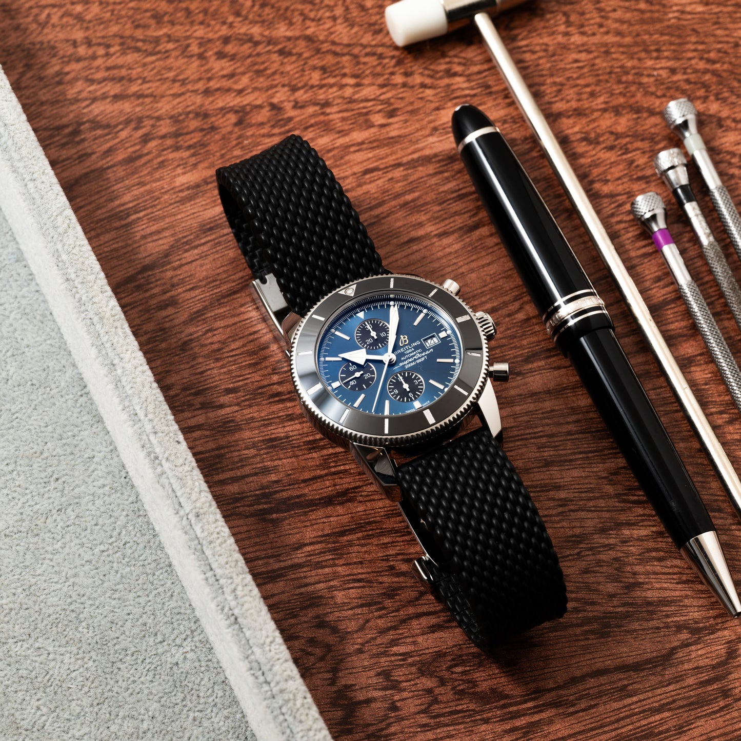 With its 44mm stainless steel case and ultra-comfortable rubber strap, this watch is surprisingly well balanced and proportioned for its size. Featuring a luminous sunburst blue dial with matching broad arrow handset, a black ceramic rotating dive bezel, black subdials, date at 3 o'clock, and of course — water resistance suitable for daily-wear and beyond, this watch packs a a big punch in both the function and the looks department.