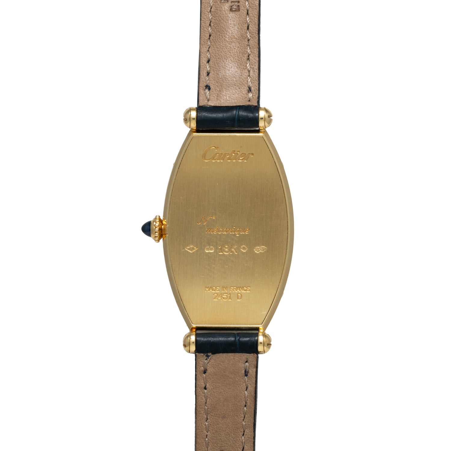 First released in 1906, two years after after the Santos Dumont, the Tonneau is one of Cartier's most longstanding, yet under the radar, references. This particular example, dates to circa 2000s and features a 21mm case with a wildly cool, curved crystal, a lovely silver guilloche dial with printed 'Roman' indices, a matching blued-steel 'Breguet' handset, and Cartier’s signature cabochon crown.