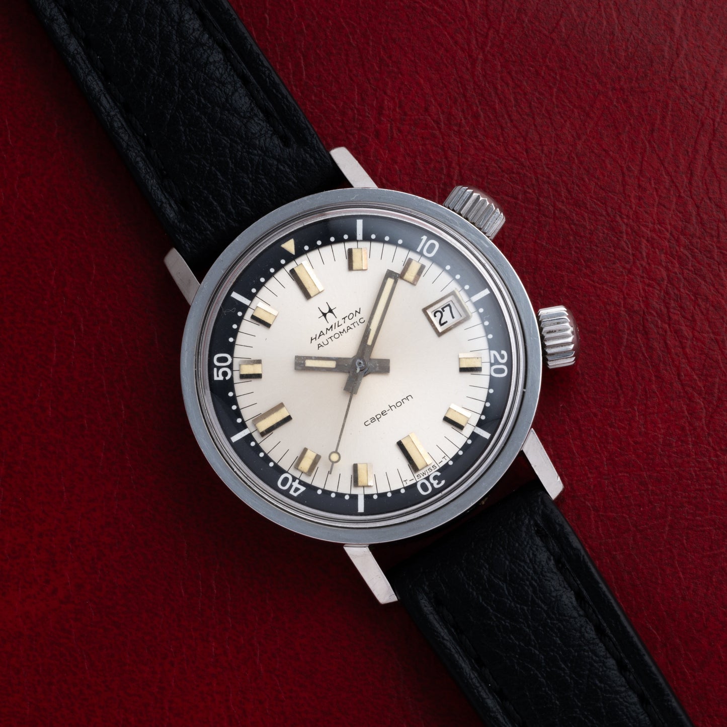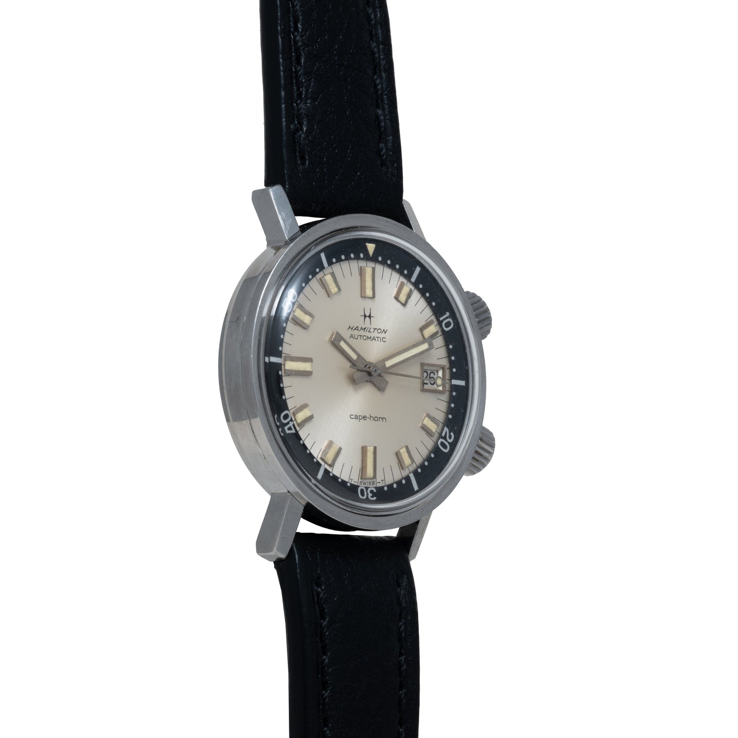 Dating to circa the early 1970s, this Cape-Horn features a 36mm stainless steel Super Compressor case, an acrylic crystal, twin ,cross-hatched crowns, a polished bezel, and a sunburst silver Tritium dial with applied indices and a date window at 3 o’clock, a matching handset, and a inner, rotating black timing ring. Powered by the automatic Hamilton Caliber 600 (ETA 2452) movement, it comes fitted to a correct J.B. Champion stainless steel bracelet with a signed blade clasp.