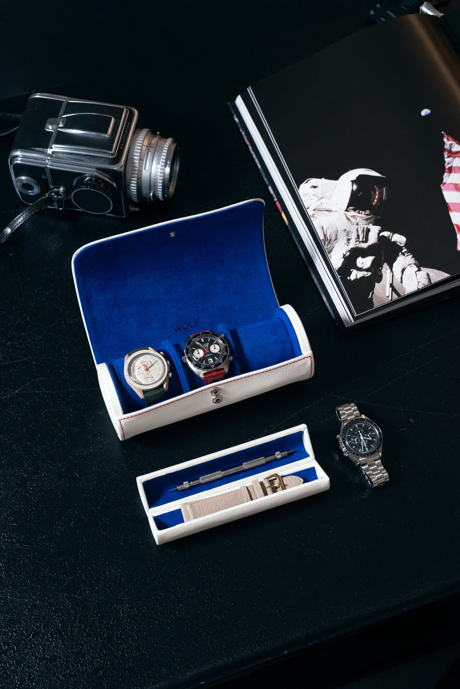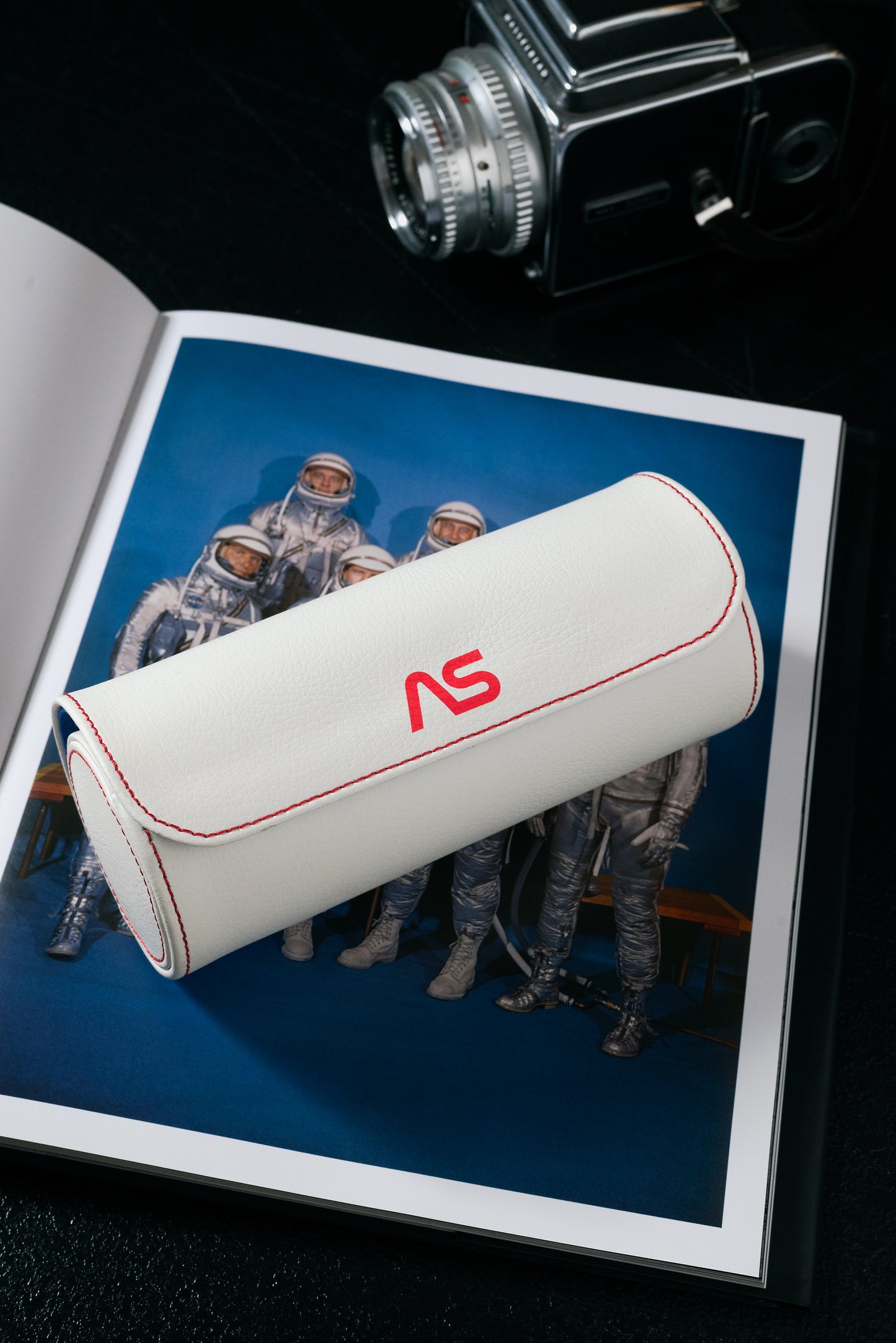 Our Moonshot 3-Piece Travel Tube is a tribute to the 1960s space race. It features a pebbled white color scheme trimmed with red stitching, a blue ultrasuede lining, and features our printed 'worm' variant logo.