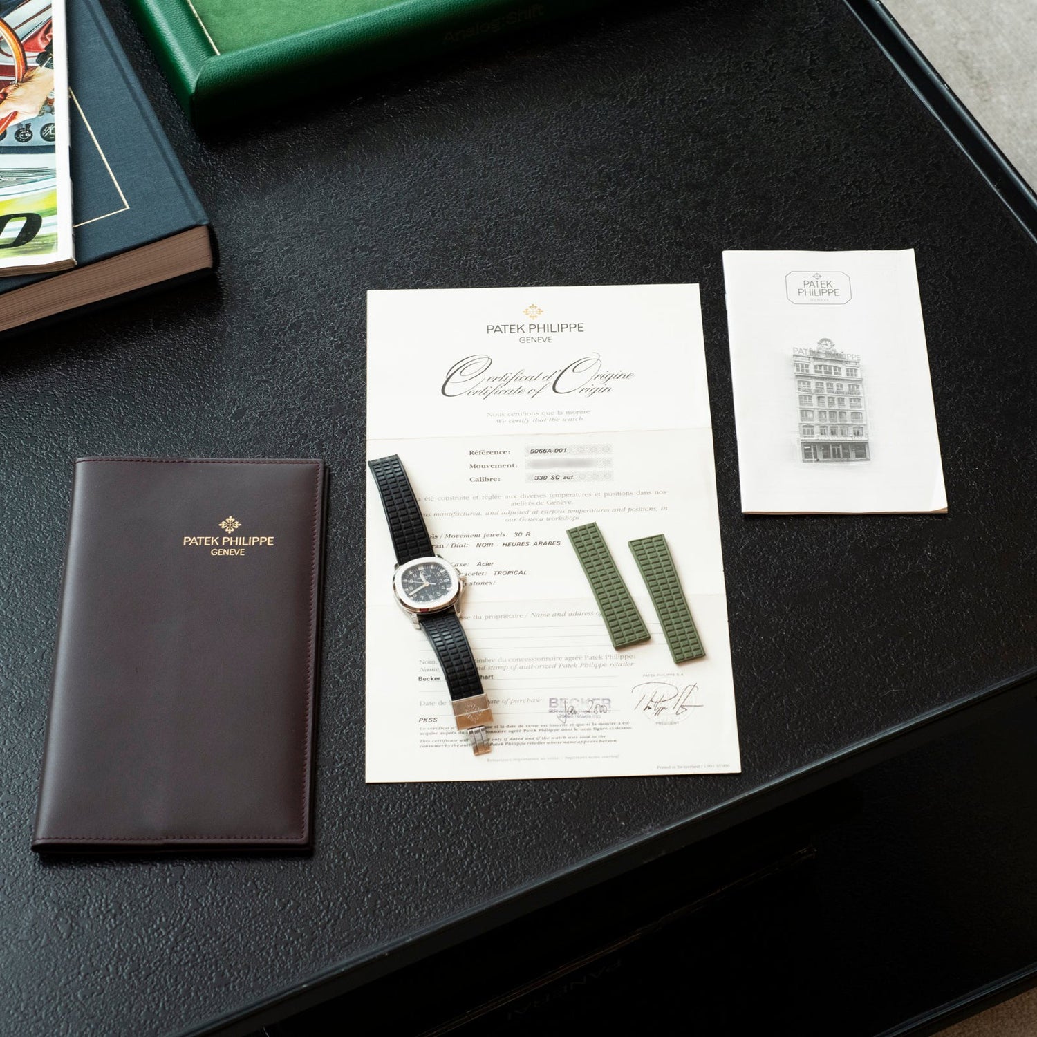 This example, a Reference 5066A, features a 36mm stainless steel case with a satin-brushed bezel hood; a sapphire crystal; a signed, screw-down crown; and a sapphire exhibition caseback framing a picture-perfect Patek Philippe Calibre 330 automatic movement.