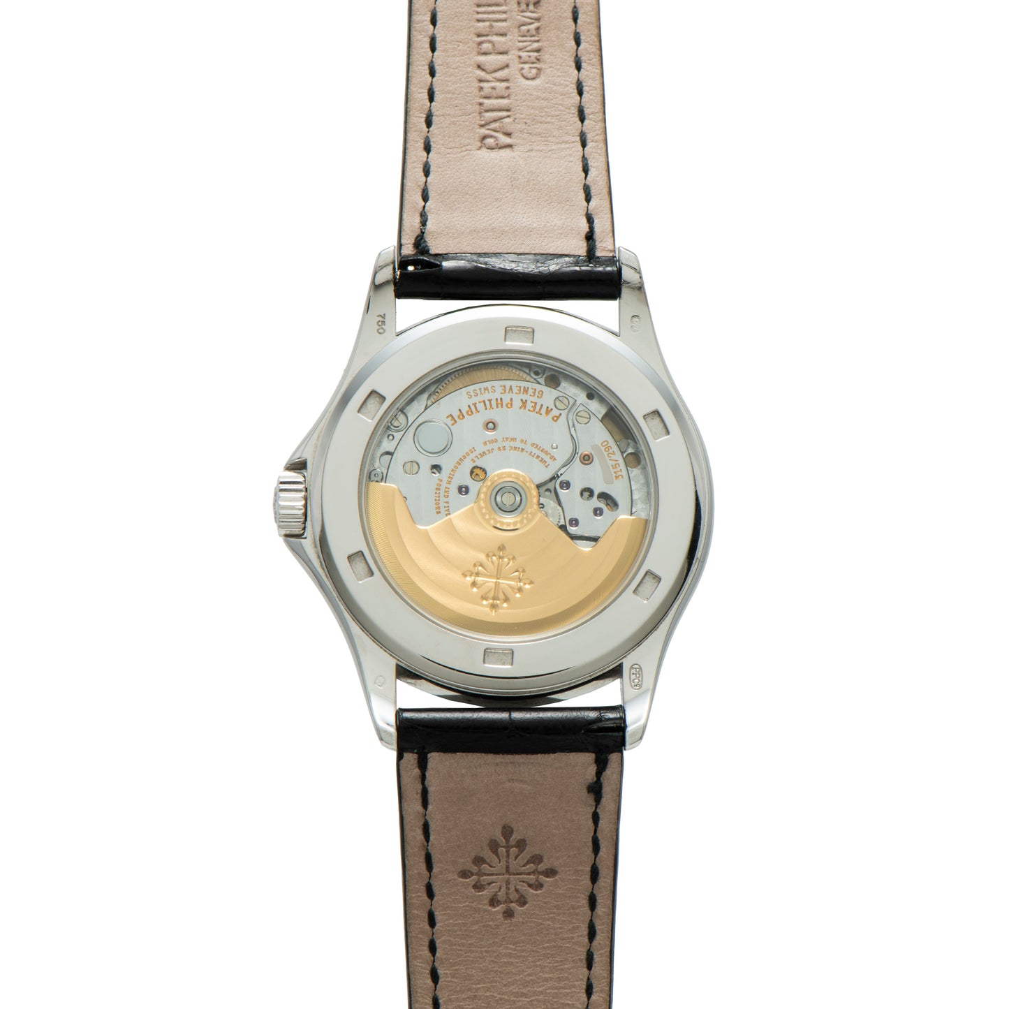 This piece, a Reference 5127G, is the very image of the elegant Calatrava design but in a modern silhouette. With a highly comfortable 37mm 18K white gold case with a slender profile, it’s an incredibly easy-wearing watch. The case features classic downturned lugs, a polished bezel, a sapphire crystal, a signed crown and a screw caseback that reveals a beautifully finished self-winding movement.