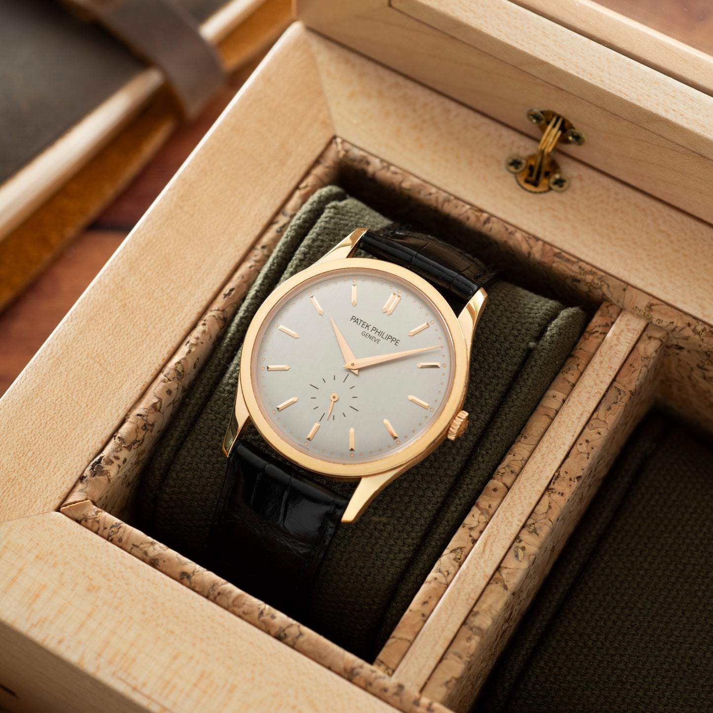 This particular Calatrava, a Reference 5196R, is housed in 37mm rose gold case with a sapphire crystal, a signed crown, and a polished bezel. It features a crisp, satin grey dial with applied indices, a sub seconds register at 6:00, and a matching 'dauphine' handset.