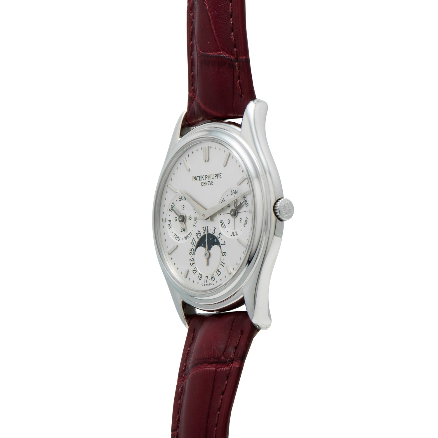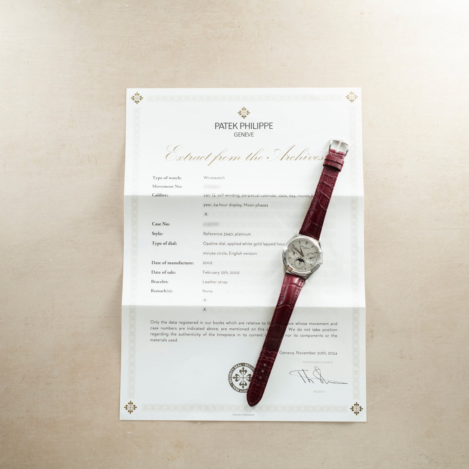This 3940P is powered by the in-house Patek Philippe Calibre 240Q movement with micro rotor, and comes equipped with a Jean Rosseau red alligator leather strap with signed platinum pin buckle. It also comes with an Extract from the Archives dating it to 2002.